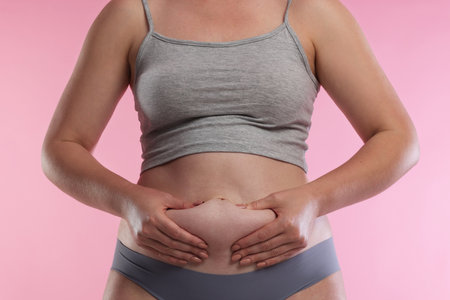 Woman in underwear touching her belly on pink background, closeup