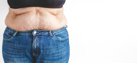 Close up of overweight woman belly with folds of skin in jeans, banner on white background with copy space for text, concept of health, aging and body care