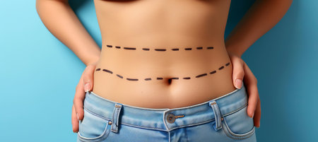 Young woman with flat belly, dashed lines for surgery, light background, copy space