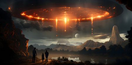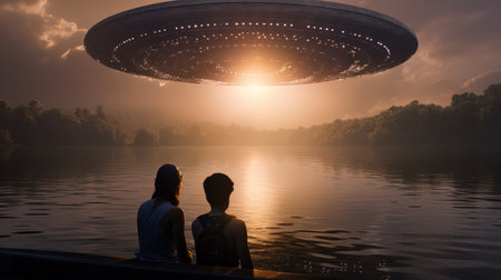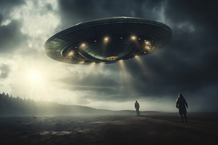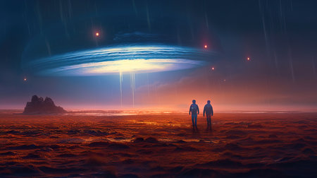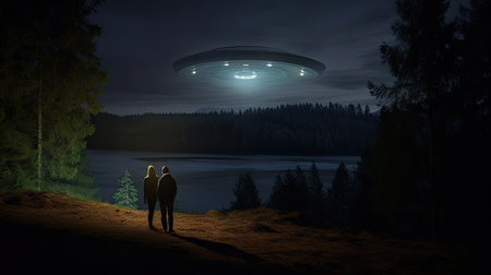 A surreal scene unfolds as a UFO hovers in the night sky, casting an ethereal beam upon two figures. A mysterious and otherworldly encounter, shrouded in an eerie atmosphere.