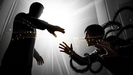 Two human figures are captured in a dramatic pose with a strong contrast between light and dark. One figure extends a hand towards the other, with light beams connecting them. The composition features a dynamic interplay of light, shadow, and lines. It could be used in various projects.