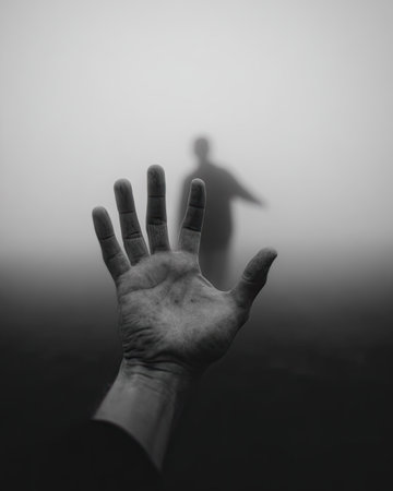 A lone hand stretches out from a misty background in a black and white photo. The atmosphere is dark and mysterious.