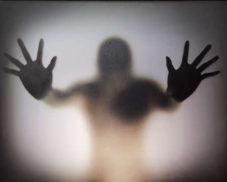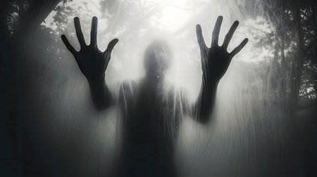 A blurry silhouette of a person behind a misty surface, their hands outstretched, creating a mysterious and haunting image.