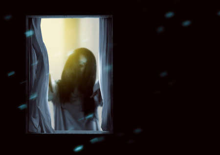 Horror ghost woman behind the matte glass. Halloween festival concept.