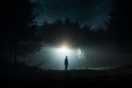 Alien spaceship beam mysterious forest night silhouette person tall pine tree blue light dramatic suspenseful extraterrestrial encounter