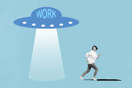 Composite picture of girl running hurry fast away ufo black white gamma isolated on blue background