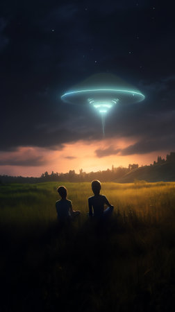 A surreal scene unfolds as a UFO hovers in the night sky, casting an ethereal beam upon two figures. A mysterious and otherworldly encounter, shrouded in an eerie atmosphere.