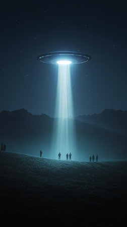 Glowing unidentified flying object illuminating a group of people on a desolate landscape at night, casting an eerie light and creating a mysterious atmosphere filled with suspense and awe