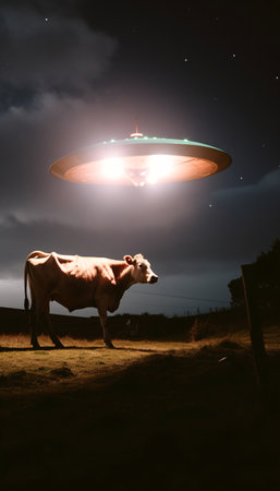 Cow abduction by aliens on a flying saucer in neon light at night in a field, generated by AI.