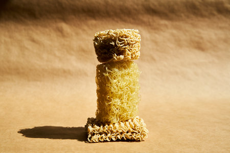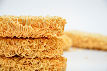 Opened Package with Uncooked Instant Noodles on Pink Background. Raw Pasta. Dry Asian Fast Food. Quick Lunch