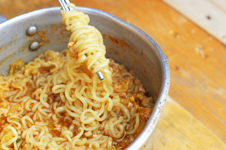 Instant pasta, Japanese and Chinese noodles. Ramen type soup in a plate with chopsticks, junk fast food. Quick-cooking pasta