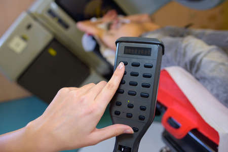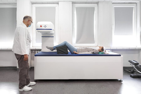 Patient lying on a stretcher of a x-ray machine next to a doctor