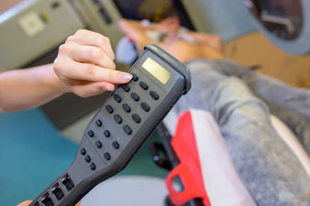 womans hand in a lie detector apparatus close-up