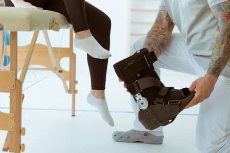 Ankle and foot external orthosis to reduce pathological mobility of ankle joints. Traumatologist puts external ankle or foot bandage on leg to recover from injuries and reduce risk of new injuries