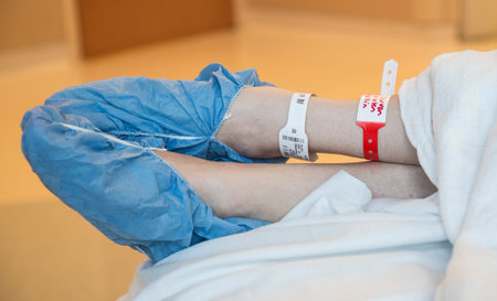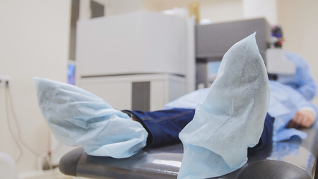 Clinic blue shoe covers on feet getting ready for surgery.