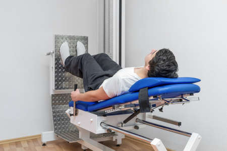 Male patient at non-surgical treatment physiotherapy of lumbar spine and spinal cord dilatation in medical center on special medical machine equipment