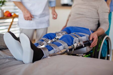 Unrecognizable healthcare worker and paralysed senior patient in hospital.