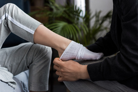 cropped image of boyfriend wearing sock on girlfriends leg