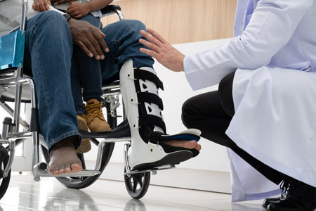 Patient in a black leg brace in a physiotherapy office