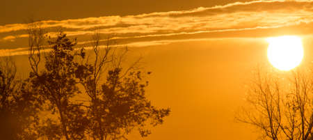 The rising sun shines brightly in the orange sky, panoramic background image.