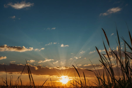 Sunset in the field with grass and sky. Nature composition.