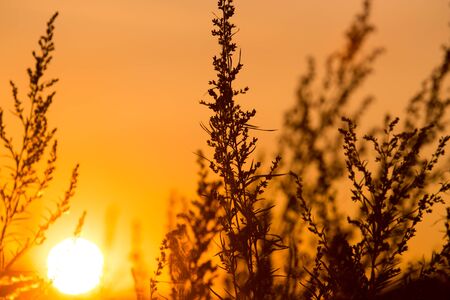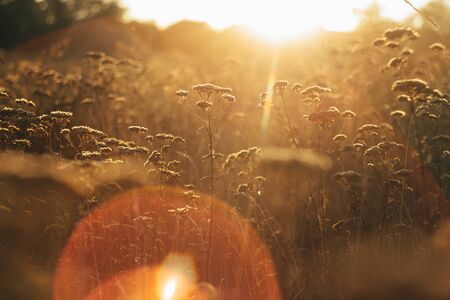 meadow plants against the backdrop of a sunny sunset, in the background a green field