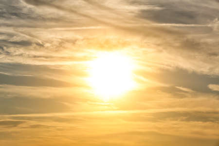 Cloudy sky at sunset or sunrise with bright sun. Abstract background for design.