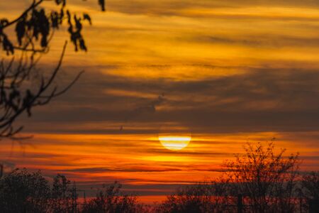 Close-up sunset through the clouds. Big orange sun.