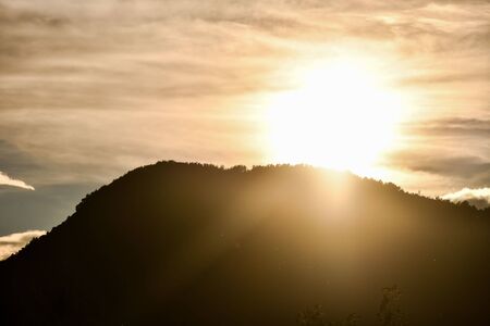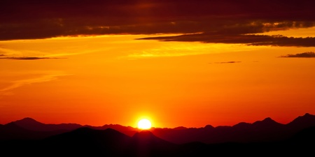 Sunrise over mountain with clouds, huge sun