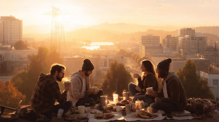 Friends gather for breakfast on rooftop during sunrise overlooking city skyline