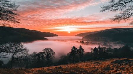 Experience the stunning beauty of a sunrise illuminating a misty valley. The vibrant colors reflect over foggy hills, creating a tranquil and picturesque scene.