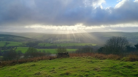large wind farm on a hilltop with dramatic clouds and sunlight breaking through --chaos 30 --ar 16:9 --v 6.1 Job ID: f29f2726-bebe-44f0-a410-c5b15191805e