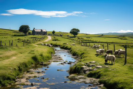 the yorkshire dales, a picturesque national park in northern england, is majestically captured in this breathtaking cityscape, blending serene hindu architectural elements with the rolling hills and lush greenery of the dales, evoking a sense of tranquility and mystique, perfect for travel and cultural enthusiasts. ai generated