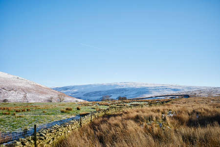 Wales, Snowdonia. Dramatic, beautiful valley. Landscape view of steep, rugged hillsides. Dry stone walls lead the eye to the distance. Copy space.