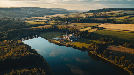 Stunning aerial view showcasing a peaceful landscape with a river, lush green fields, and distant hills. Perfect for illustrating natural beauty and tranquility.