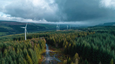 An aerial perspective showcases wind turbines amid a dense forest. The scene features lush green trees and a pathway leading to the turbines, set under a dramatic cloudy sky. The photograph's composition and lighting suggest commercial applications for environmental themes and sustainable practices.