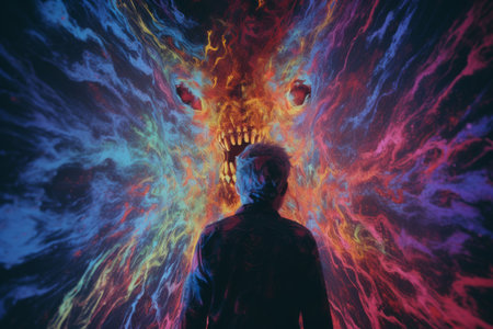 A person stands surrounded by colorful swirling lines and abstract shapes, engaged in a mesmerizing exploration of perception and creativity.