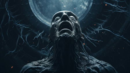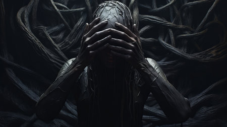 a photo featuring a collection of horror wallpapers, creepy wallpaper, art wallpapers, and weird wallpapers. the image showcases monochromatic sculptor-inspired designs with tangled nests and dark, dramatic chiaroscuro portraits. the photorealistic detail is enhanced by the dark silver and yellow color scheme, effectively capturing trapped emotions. this composition is influenced by afrofuturism, resulting in a captivating and eerie aesthetic. ai generated