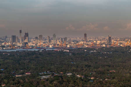 Bangkok, thailand - Mar 06, 2020 : Sky view of Bangkok with skyscrapers in the business district in Bangkok in the evening beautiful twilight give the city a modern style. Selective focus.