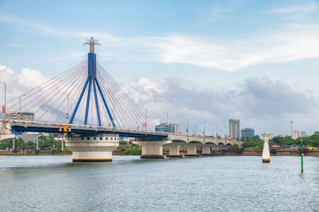 Wonderful view of the Han River Bridge (Cau Song Han) over the Han River at downtown of Da Nang (Danang), Vietnam. Scenic cityscape. The Han River Bridge is a popular tourist attraction of Asia.