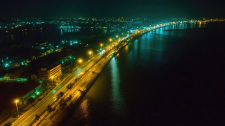 This stunning nighttime aerial view captures the illuminated banks of Thailand's river, showcasing vibrant lights and serene reflections in the water.