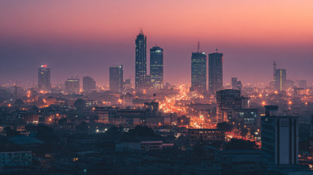 This captivating panorama showcases the vibrant cityscape at dusk, featuring tall skyscrapers illuminated by city lights amidst a soft haze, creating a tranquil urban atmosphere.