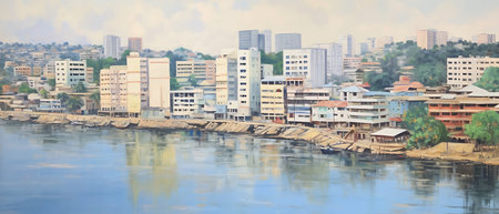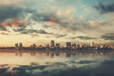 Majestic Cityscape: Embracing a Serene Waterfront beneath an Overcast Sky