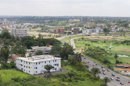 ABIDJAN, IVORY COAST (CôTE D'IVOIRE), AFRICA. April 2013. The view of the Cocody quarter of Abidjan, the economical capital of the Côte d’Ivoire (Ivory Coast). Abidjan city stock image.