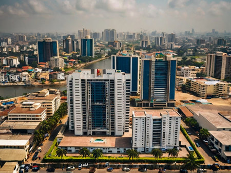 An overhead perspective of a cityscape as the sun sets, showcasing the urban landscape bathed in warm golden light, Aerial view of Lagos's dynamic cityscape, AI Generated