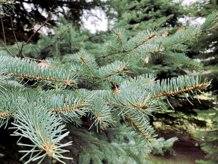 Spruce tree branches in summer park.