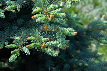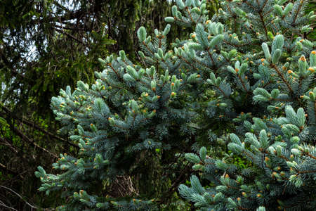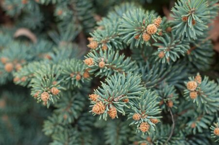 young branches of blue spruce with small buds of cones close-up texture for decor and design