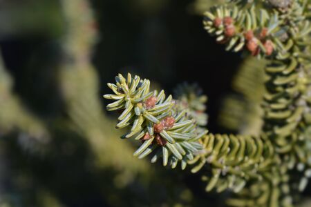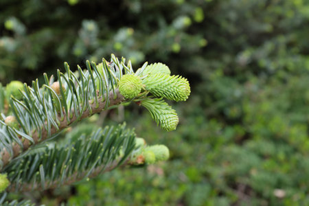Young spruce abies species cones growing on branch with fir, closeup detail