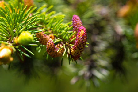 Young red fir buds on spruce branches close up. spring season. Blossom fresh fir buds - healthy drug in alternative medicine.