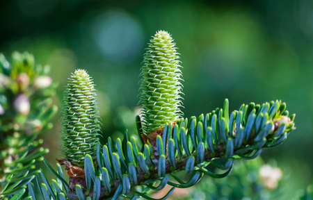 A branch of Korean fir with young cones in spring garden